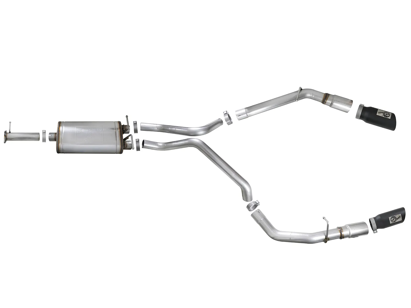 System wykończony podwójnymi końcówkami o średnicy 5" z czarnej stali nierdzewnej 304. Na końcówkach znajduje się nitowana tabliczka z logo aFe POWER, nadająca stylowy wygląd.