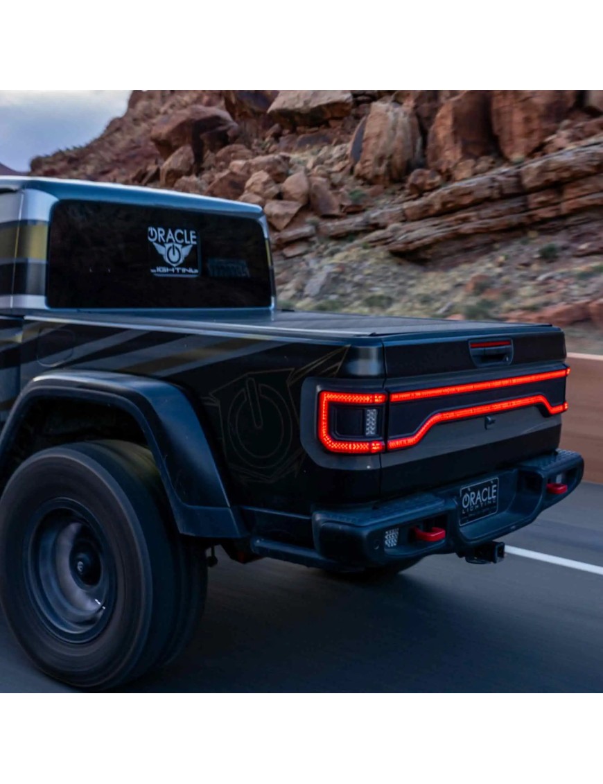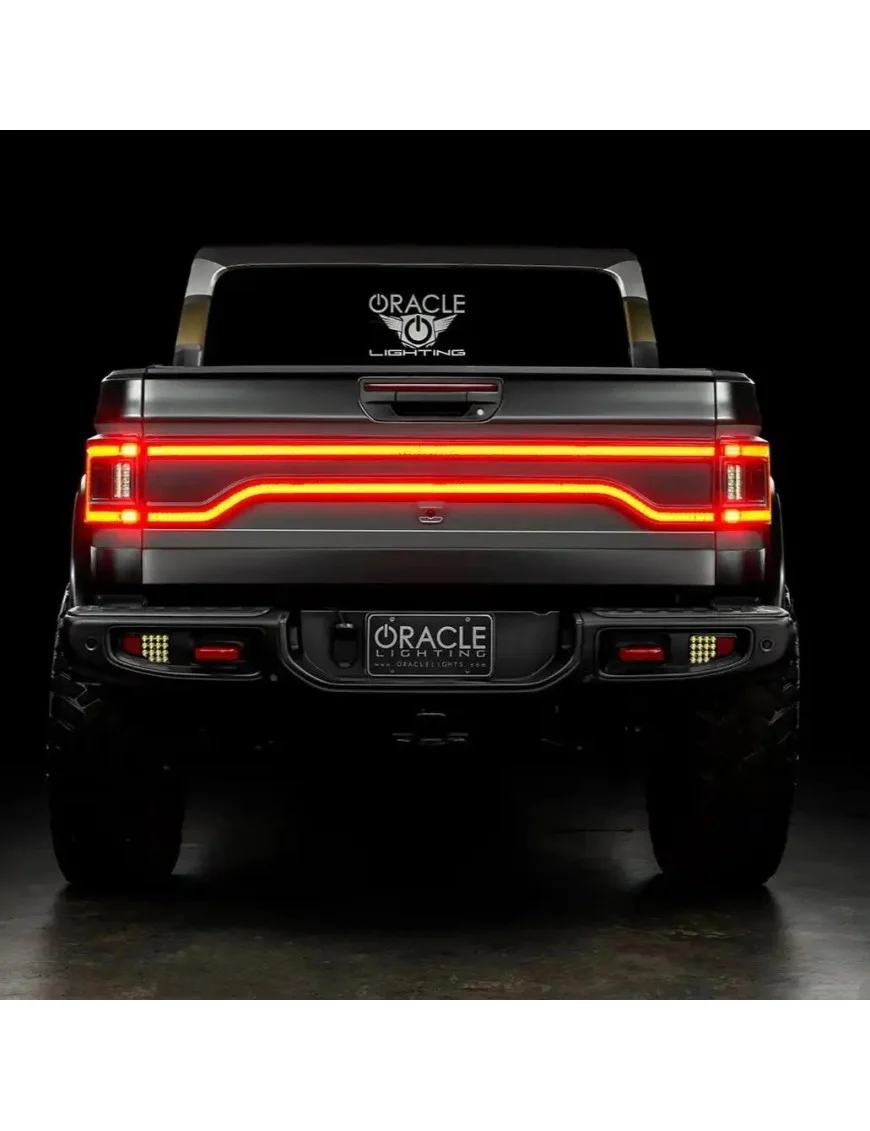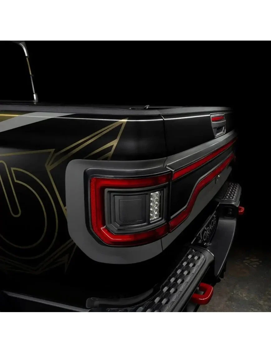 Panel LED na klapę tylną w stylu „Racetrack” to rozwiązanie dla właścicieli Jeepa Gladiatora JT, którzy chcą uzyskać wyrazisty, ciągły podpis świetlny pomiędzy lampami tylnymi typu flush. Element tworzy jednolitą linię światła na całej szerokości klapy, poprawiając czytelność sygnałów podczas jazdy i manewrów.