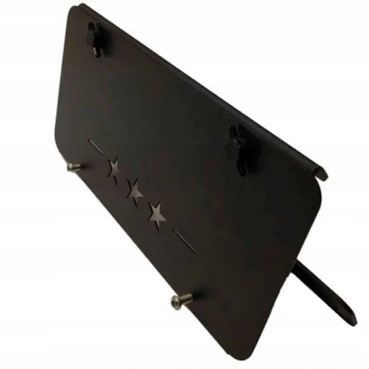 Uchwyt do tablicy montowany jest do stelażu na śruby motylkowe – przed wjazdem w teren odkręcasz dwie śrubki i chowasz tablice do auta. Zestaw zawiera niezbędne śruby. Zaprojektowany do użycia z oryginalnym zderzakiem stalowym Rubicon ale będzie pasować do każdego zderzaka przedniego po wywierceniu 2 otworów montażowych. Idealny pod krótkie tablice ale pasuje także do standardowych tablic.