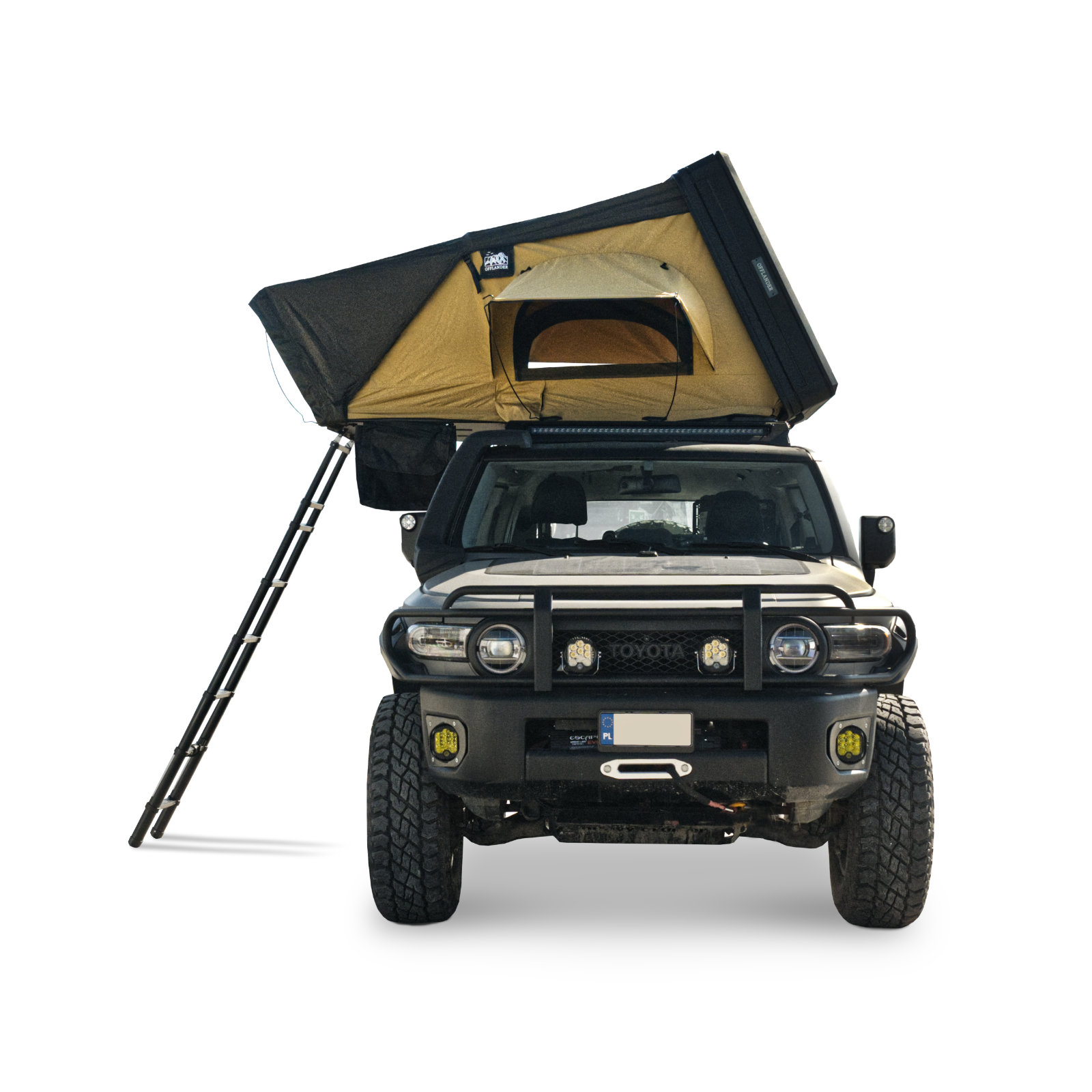 Do namiotu dołączono również solidną, teleskopową drabinkę aluminiową, dzięki której wejście do środka jest bezpieczne – niezależnie od wysokości montażu. Zadbaliśmy też o dodatkową ochronę przed niesprzyjającą pogodą. Przeciwdeszczowa osłona wejścia oraz praktyczne zadaszenie tworzą funkcjonalną strefę przed namiotem – idealną na szybki odpoczynek, przygotowanie posiłku czy schowanie rzeczy przed słońcem i deszczem.
