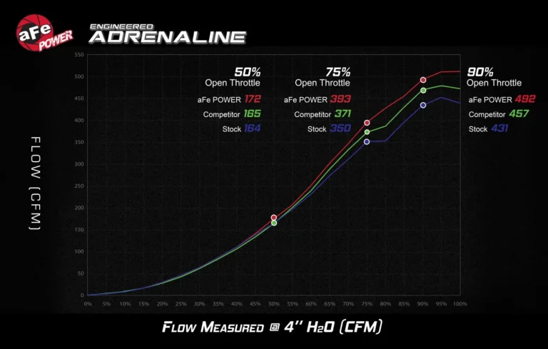 Testy przeprowadzone na hamowni aFe POWER wykazały wzrost o +17 KM i +15 lb-ft przy 6,000 obr./min., porównując fabryczną przepustnicę z wersją aFe POWER BTB. Wszystkie testy przeprowadzono przy użyciu paliwa 91-oktanowego bez innych modyfikacji, co daje ogromny potencjał do dalszego zwiększenia osiągów poprzez dodanie systemu dolotowego, tunera lub układu wydechowego.