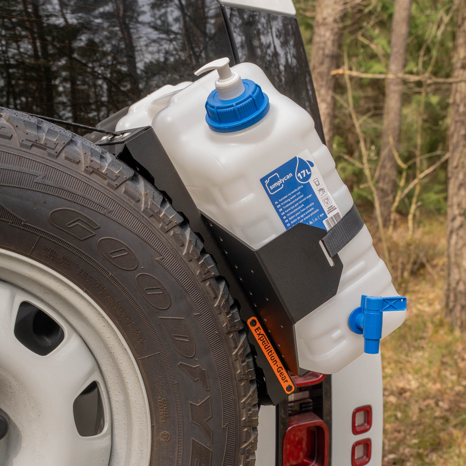 Uchwyt 4x4 może być wykorzystany nie tylko jako platforma do mocowania kanistra na kole zapasowym ale także jako baza do montażu uchwytów Quick-fist/Fit-Rub. W płycie na akcesoria otwory są dopasowane do mocowań kanistrów Rotopax i Expedition-Gear. Po połączeniu z uchwytem zbiornika na wodę otrzymamy mobilną umywalkę campingową.