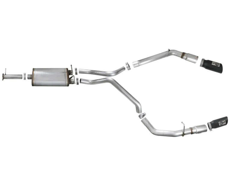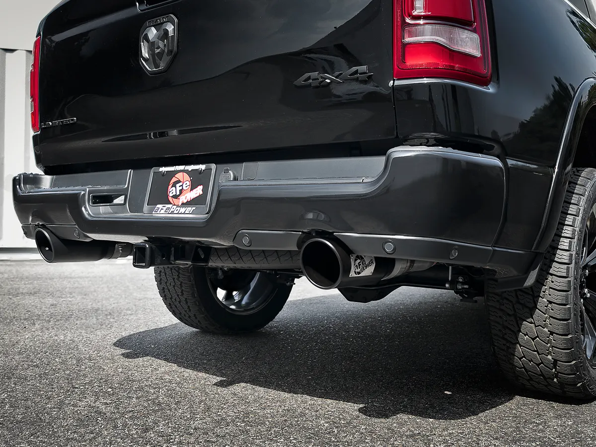 Końcówki wydechu z czarnej stali nierdzewnej, o średnicy 5", zakończone logo aFe POWER, zapewniają stylowy, spersonalizowany wygląd.