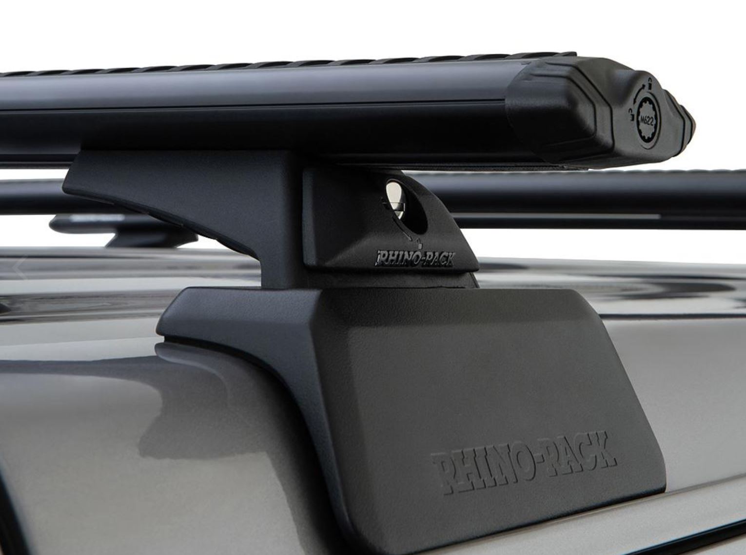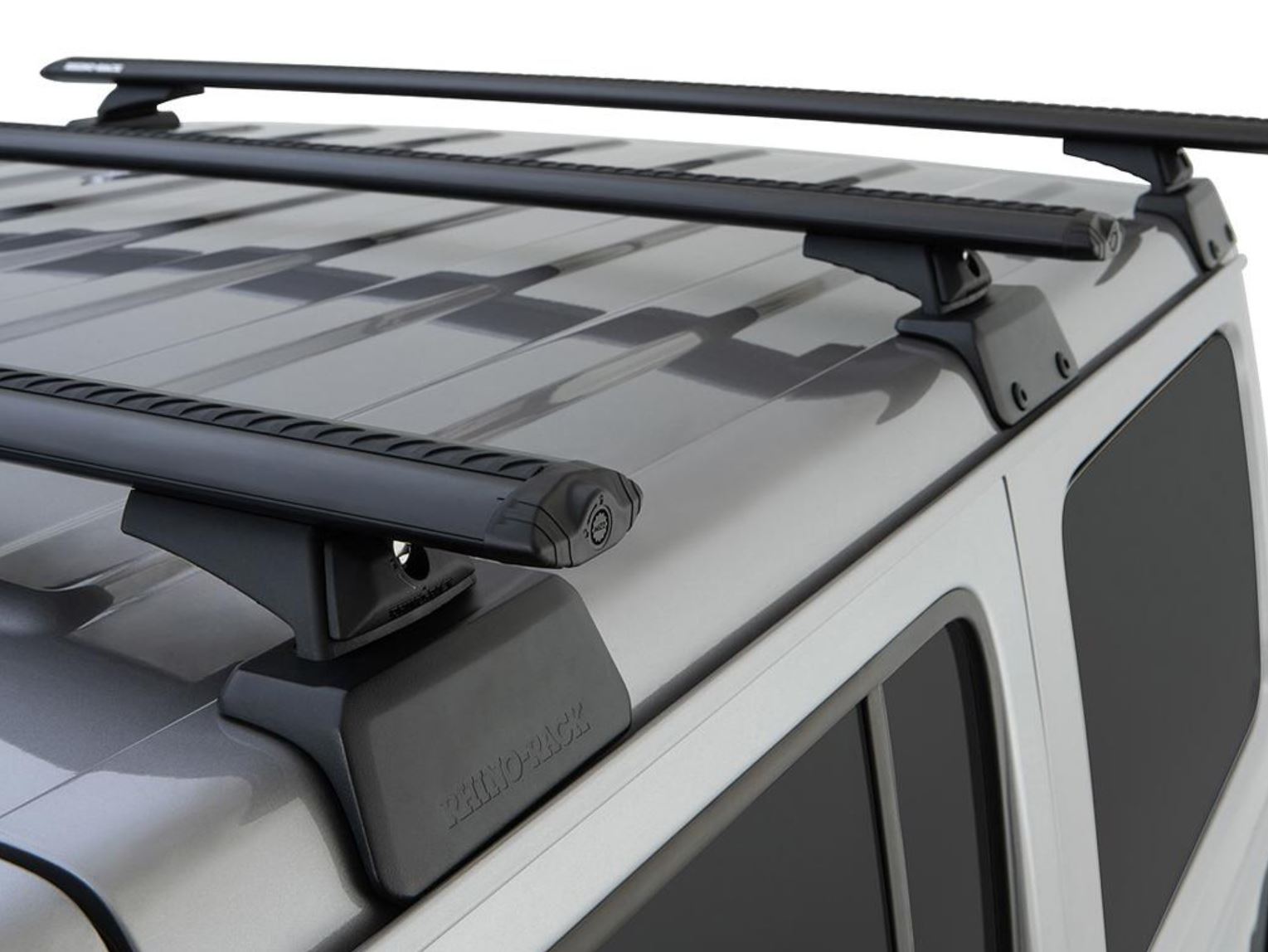 Komplet trzech belek dachowych Rhino Rack z najnowszej serii Sportz podpieranych w tylnej części za pomocą specjalnej konstrukcji wzmocnienia Rhino Rack Backbone.
